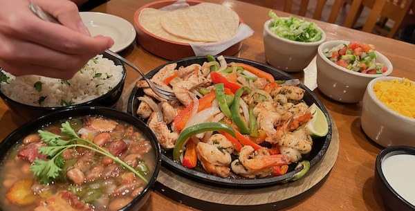 Each platter comes with all the traditional fixings, including grilled onions, bell peppers, pico de gallo, cheddar cheese, sour cream, tortillas, rice, and beans.